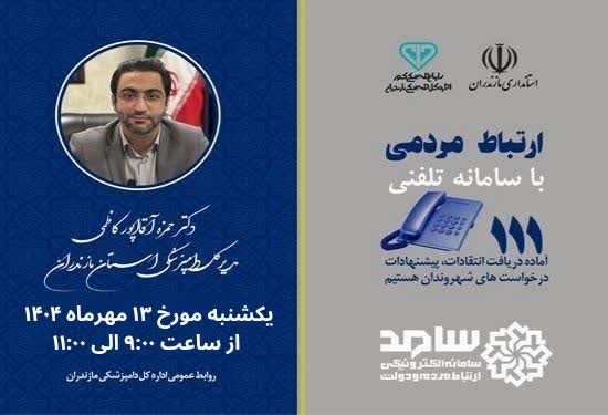 مدیرکل دامپزشکی استان مازندران یکشنبه مورخ ۱۳ مهرماه ۱۴۰۴ از ساعت ۹:۰۰ الی ۱۱:۰۰ از طریق سامانه ارتباط مردمی دولت و مردم(سامد) پاسخگوی سوالات و درخواست‌های مردم استان مازندران خواهد بود.
